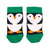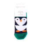 These adorable penguin baby socks feature a large penguin on the front with huge white belly, black flippers and orange beak and feet. These socks have a contrast green band, toe and heel detail - their green colour makes them a perfect festive sock!