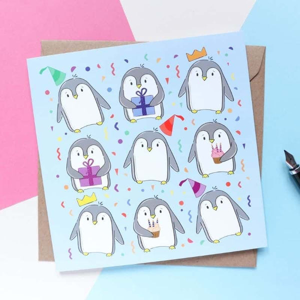 Wish a friend a Happy Birthday with this adorably cute Penguin birthday card. This is a lovely illustrated Birthday Card features a cute penguin illustration, with 9 penguins wearing party hats, bringing gifts or holding a cake - perfect for wishing a friend or family member the happiest of birthdays.