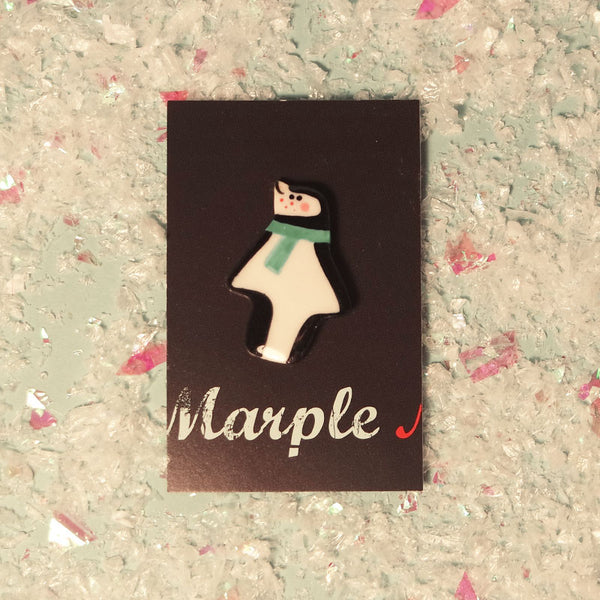 Penguin in Blue Scarf Ceramic Brooch by Miss Marple Makes