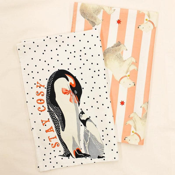 Featuring one tea towel with a super cute mother and baby penguin illustration on a white polka dot background, and a second tea towel with cuddly polar bears on a white and cream striped background, this gorgeous set of two Yvonne Ellen Tea Towels are guaranteed to add a splash of colour and charm to any kitchen.