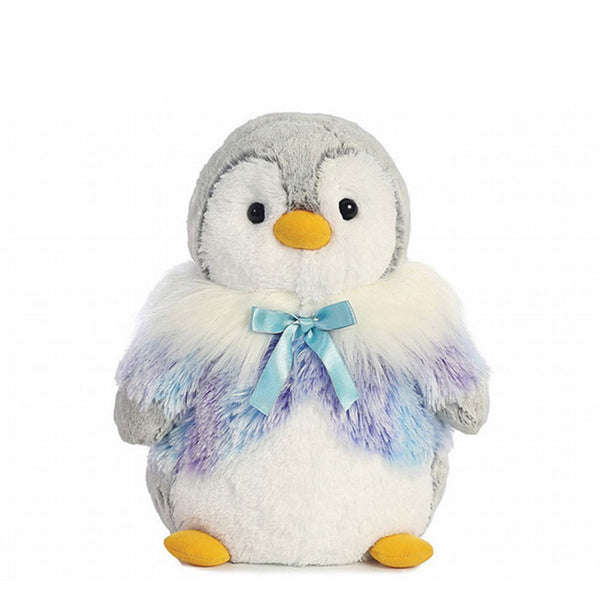 This penguin plush measures 29cm tall and features a brightly coloured beak and feet, making this penguin stand out from amongst the crowd. The blue and purple long hair fabric is part of the main body of this fuzzy cuddly toy, giving him the appearance of wearing a coat! His brightly coloured beak is soft and firm, perfect for nuzzling you when it's cuddle time.