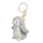 This super cute PomPom Baby Penguin pram toy features grey and white soft dual tone plush terry cloth like fabric, and features a rattle inside for sensory play - this dangles from a bungee cord, that is connected with a large oval clip with a gap that slides over the pram.