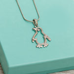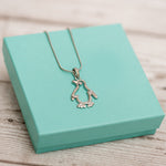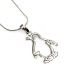 This lovely silver penguin necklace features the outline of a penguin and is finished with a sparkly gem as the eye, and one on each flipper and foot. The penguin pendant dangles on a gorgeous snake chain that has an extender - so you can choose where it sits when worn.