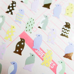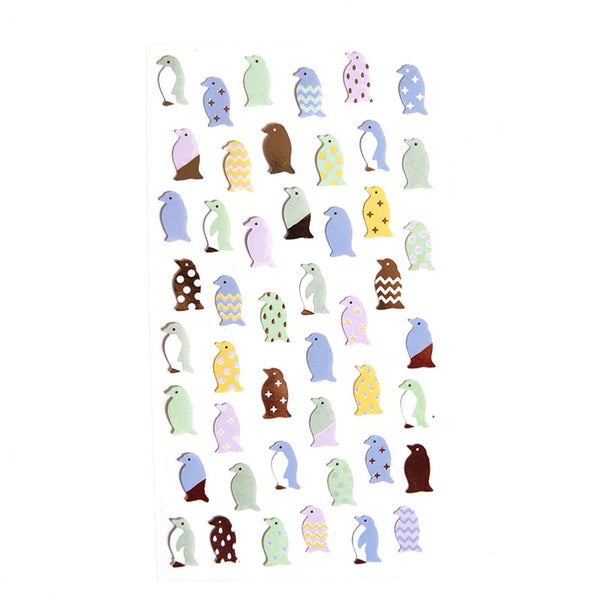 Featuring penguin stickers in a selection of pastel colours including lilac, green, and yellow, some with patterned accents, and some penguin stickers are hot stamped in gold which shimmers in the light.